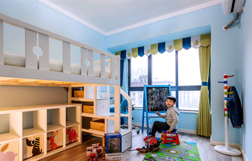 3、兒童房的空間一般不及主人房,需要合理規(guī)劃,雙層床可以有效利用高度,上層為睡眠區(qū),下層為收納區(qū),騰出游戲空間。