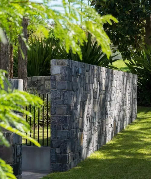 石頭圍墻。石材的圍墻也是多種多樣,毛石是自然式庭院圍墻選用最多的材料,天然的肌理和氣質,透露著狂野的自然氣息。
