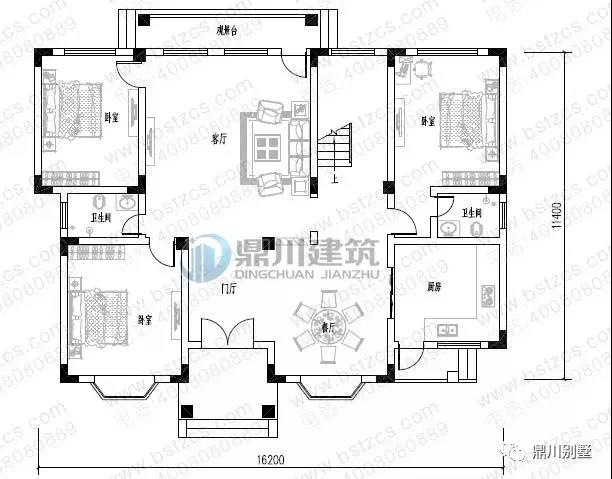 一 層:門廳、客廳(附觀景臺(tái))、臥室(附衛(wèi)生間)、2臥室、廚房、餐廳、衛(wèi)生間