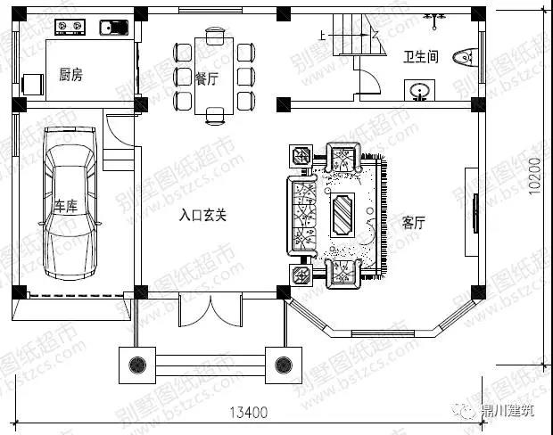 一 層:入口玄關(guān)、客廳、廚房、餐廳、衛(wèi)生間、車庫(kù)
