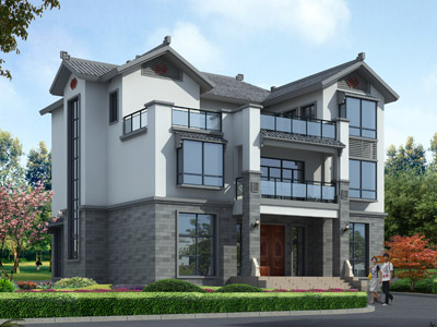 E047新中式三層帶露臺小別墅設(shè)計(jì)圖,中式別墅設(shè)計(jì)外觀圖