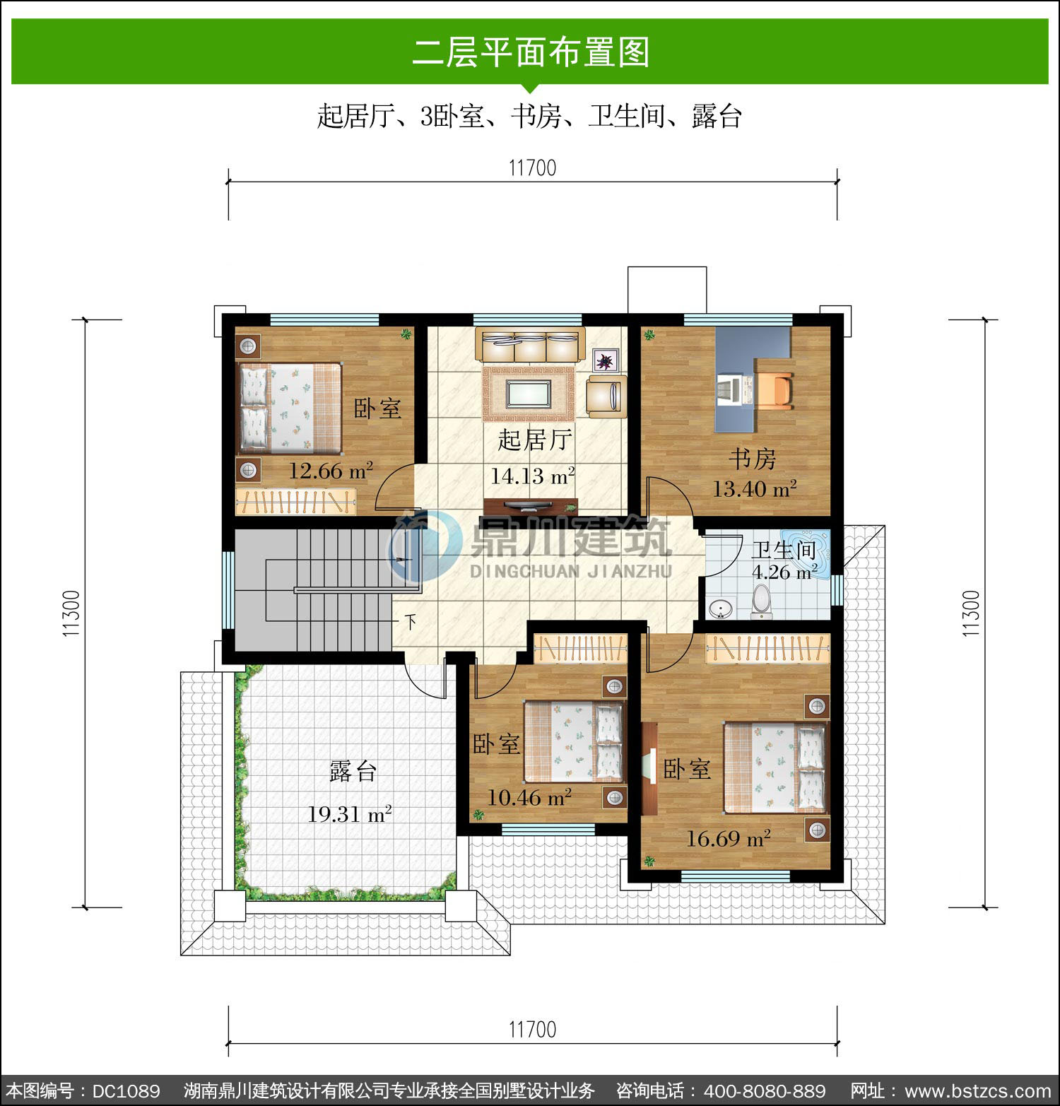 二 層: 起居廳、3臥室、書房、衛(wèi)生間、露臺