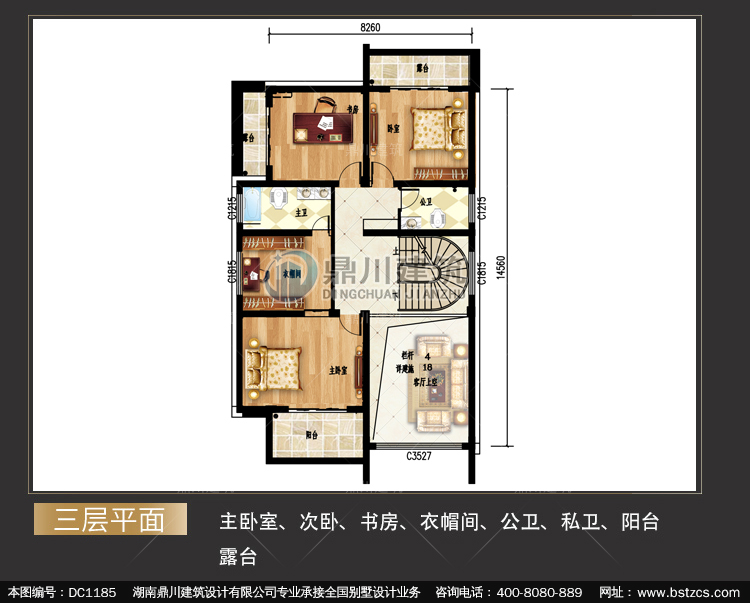 三 層: 主臥室、次臥、書房、衣帽間、公衛(wèi)、私衛(wèi)、陽臺、露臺