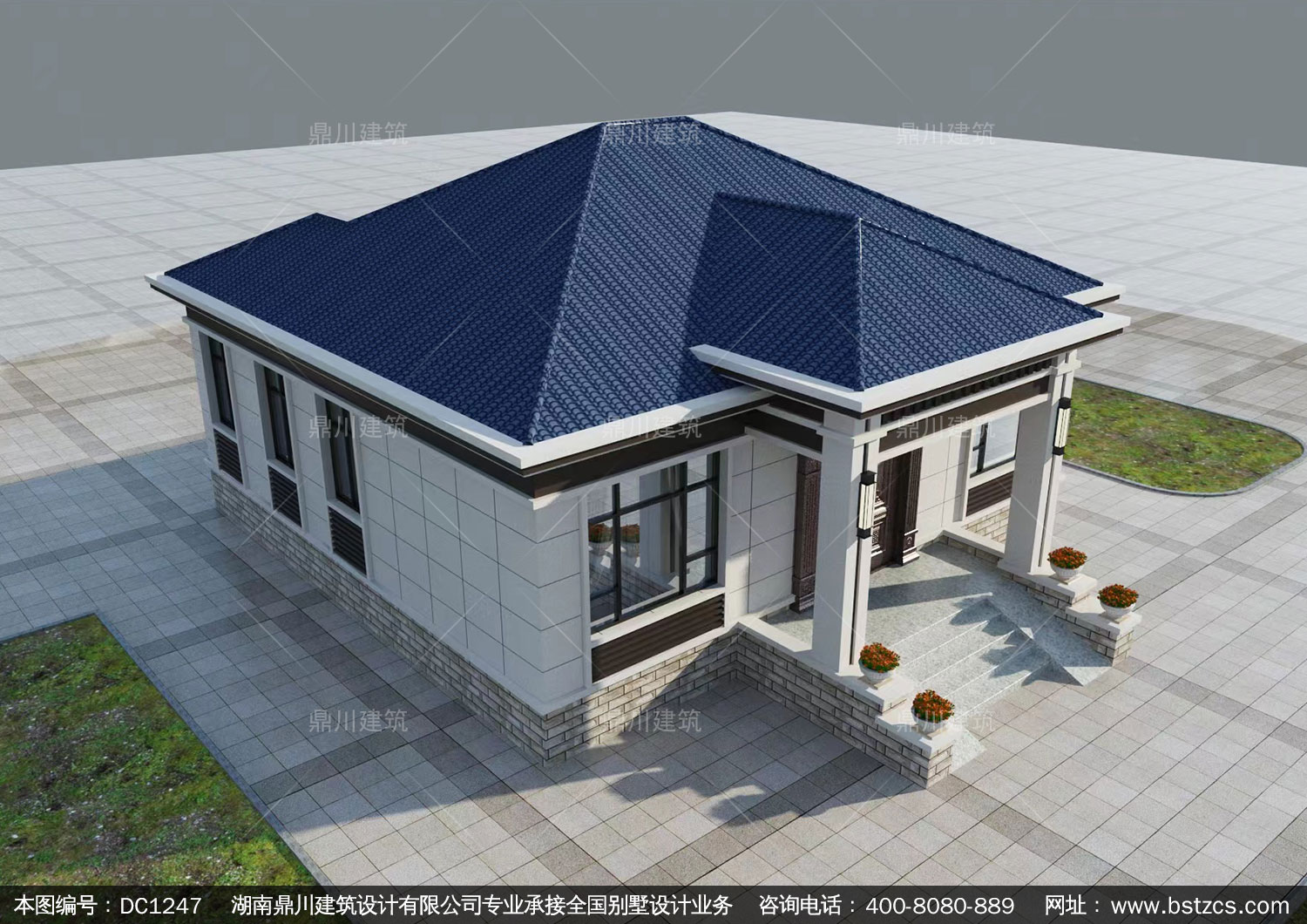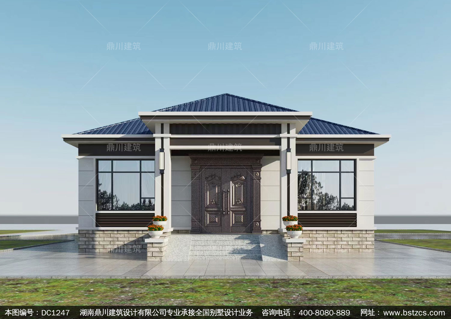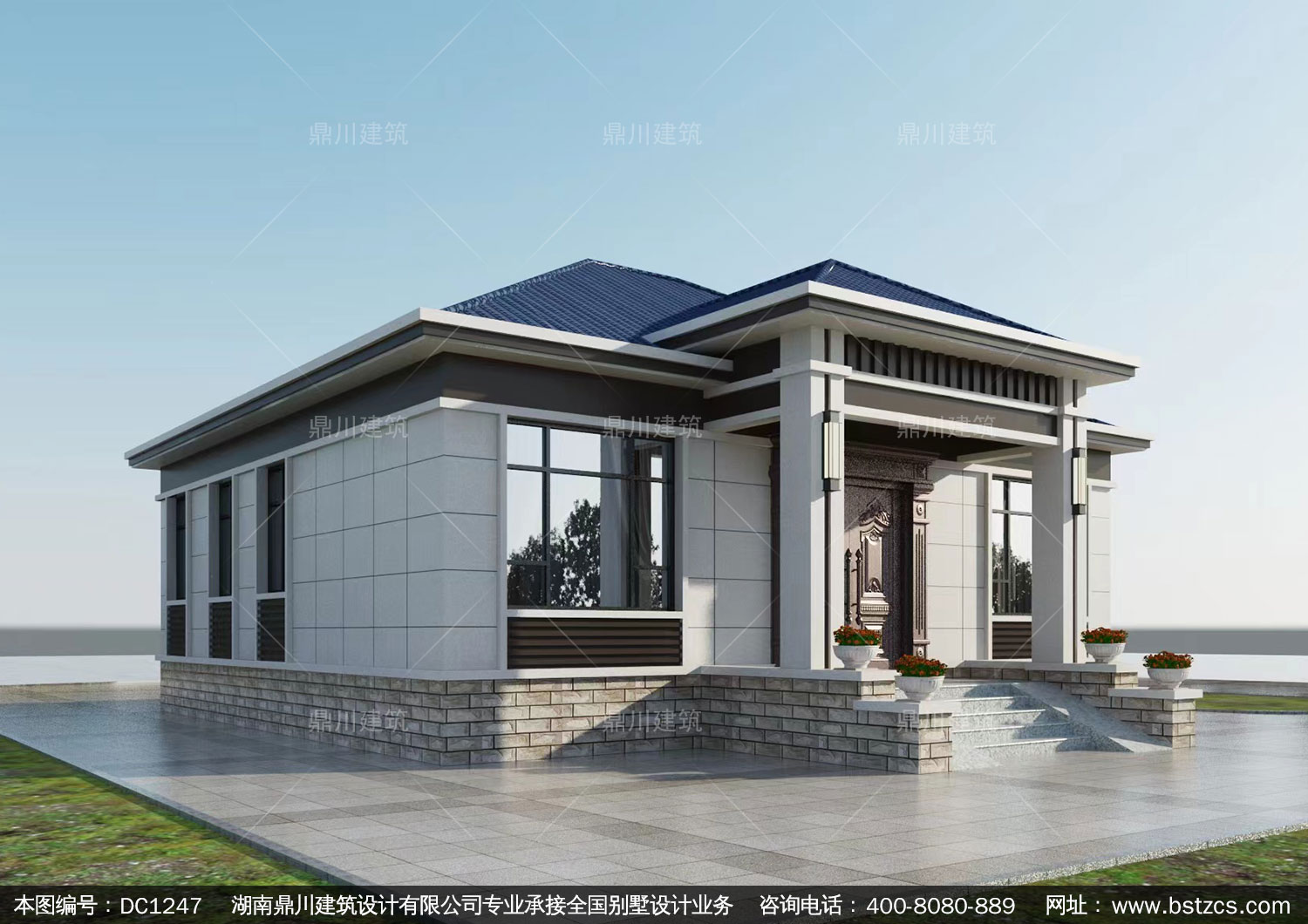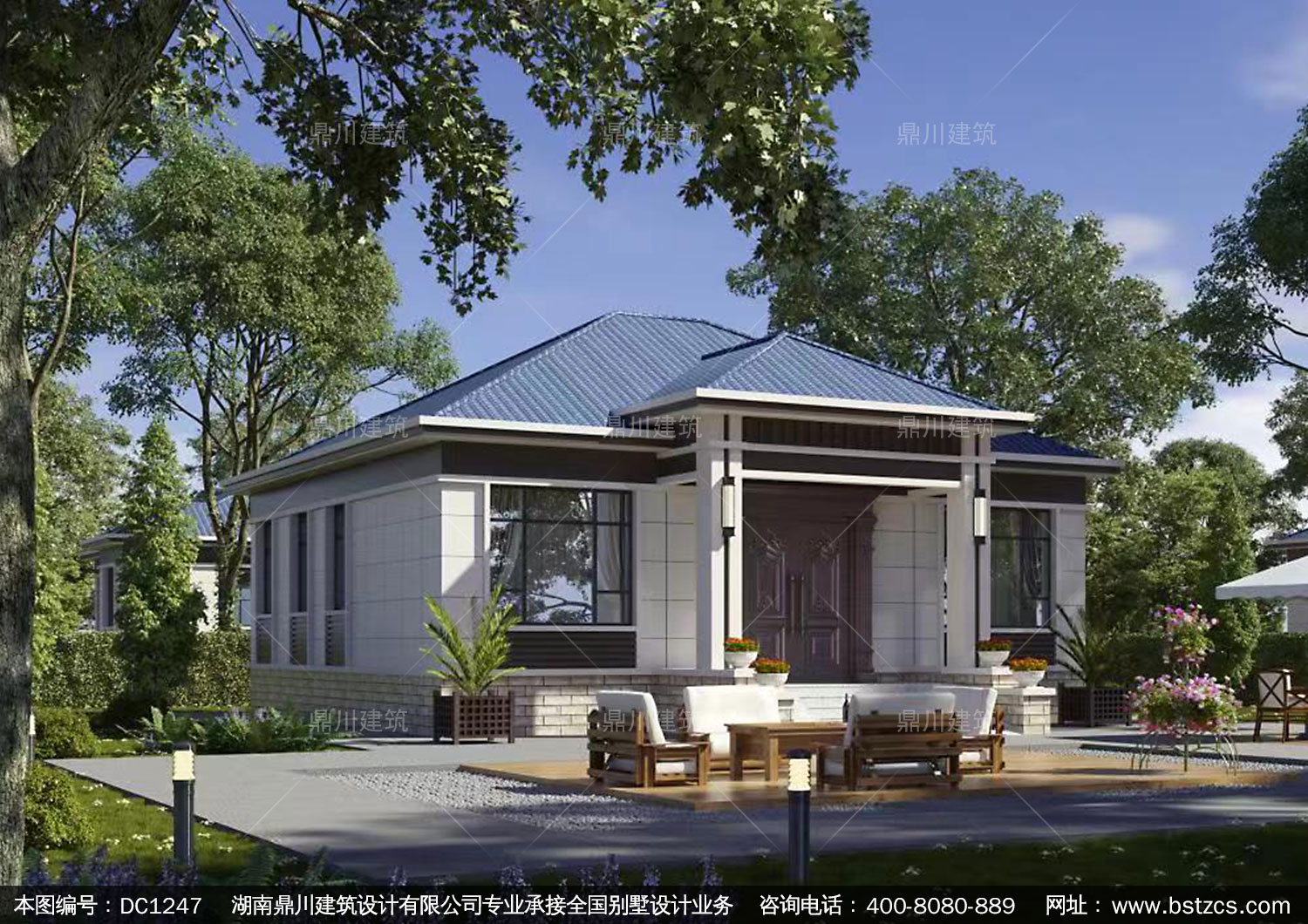 新中式一層別墅施工圖紙及外觀效果圖_農村自建別墅設計,鼎川建