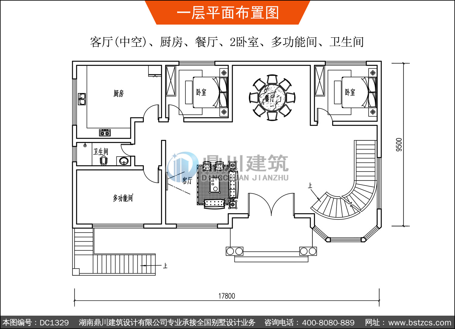 一 層: 客廳(中空)、廚房、餐廳、2臥室、多功能間、衛(wèi)生間