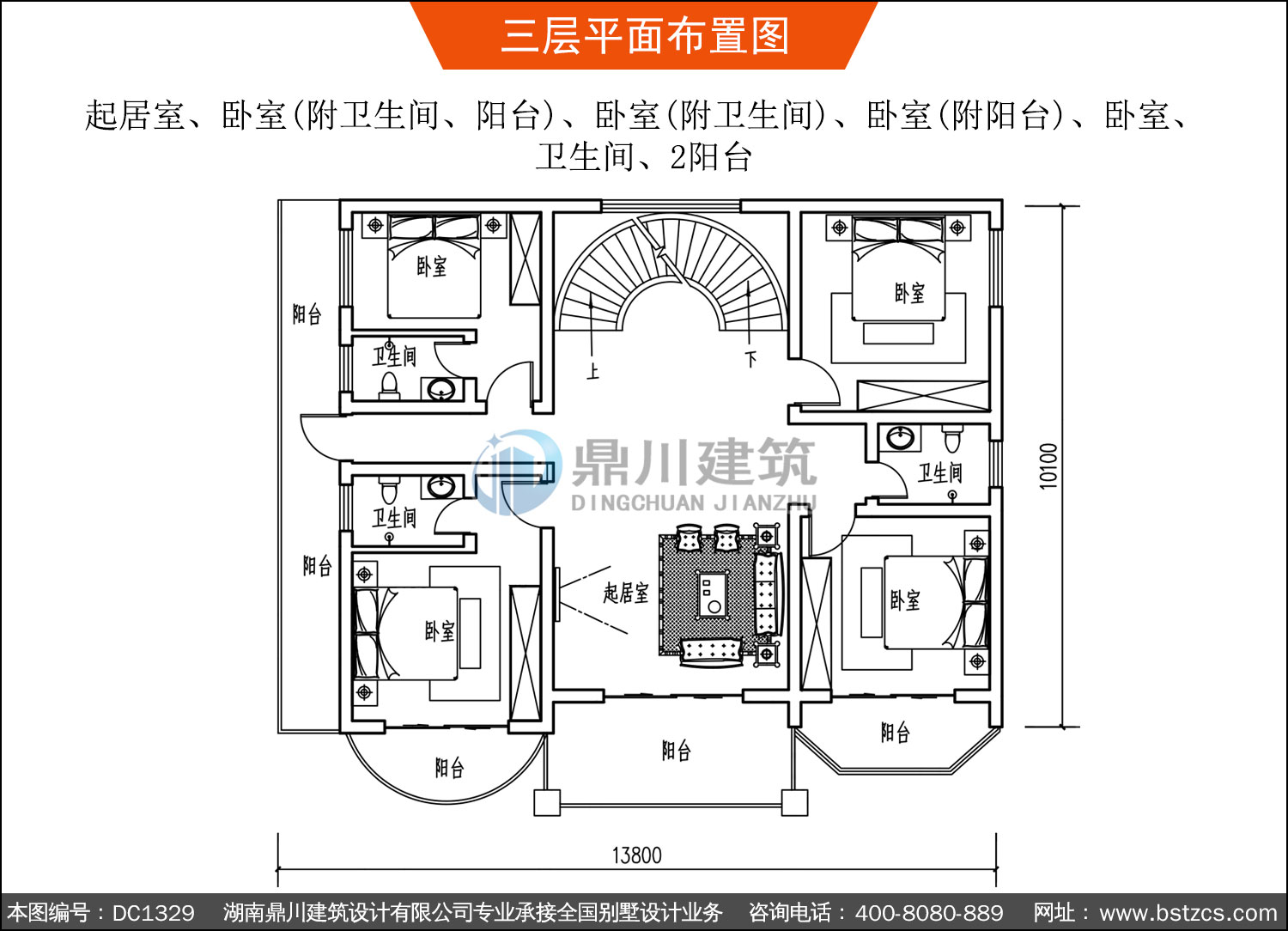 三 層: 起居室、臥室(附衛(wèi)生間、陽臺)、臥室(附衛(wèi)生間)、臥室(附陽臺)、臥室、衛(wèi)生間、2陽臺