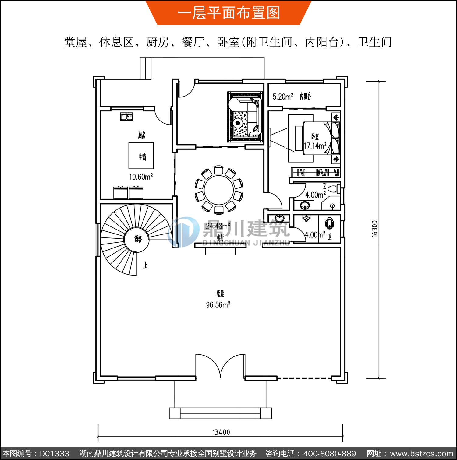 一 層: 堂屋、休息區(qū)、廚房、餐廳、臥室(附衛(wèi)生間、內(nèi)陽臺)、衛(wèi)生間
