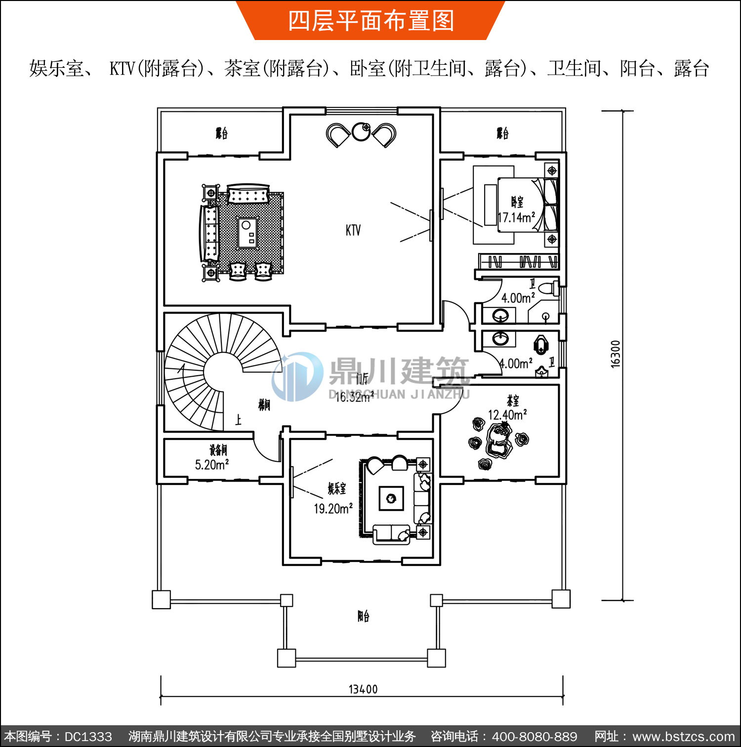 四 層: 娛樂室、 KTV(附露臺)、茶室(附露臺)、臥室(附衛(wèi)生間、露臺)、衛(wèi)生間、陽臺、露臺