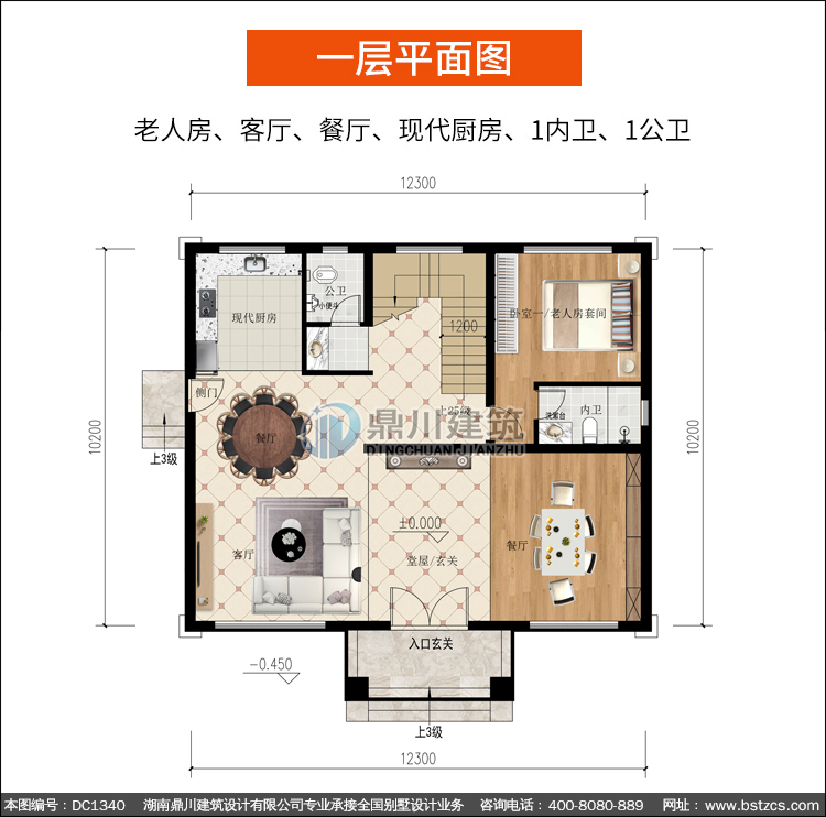 | 一 層: | 老人房、客廳、餐廳、現(xiàn)代廚房、1內(nèi)衛(wèi)、1公衛(wèi) | |||