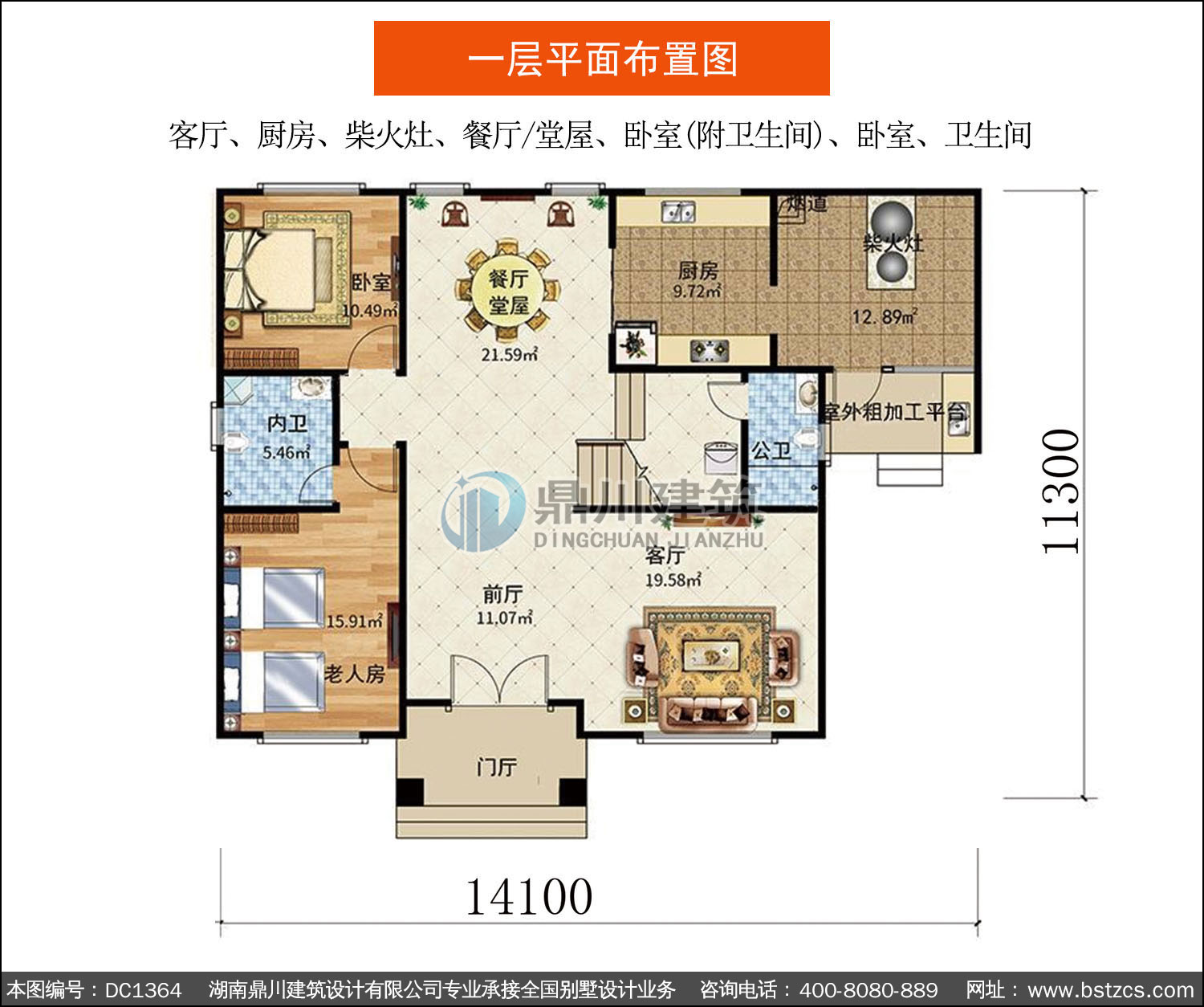 一 層: 客廳、廚房、柴火灶、餐廳/堂屋、臥室(附衛(wèi)生間)、臥室、衛(wèi)生間