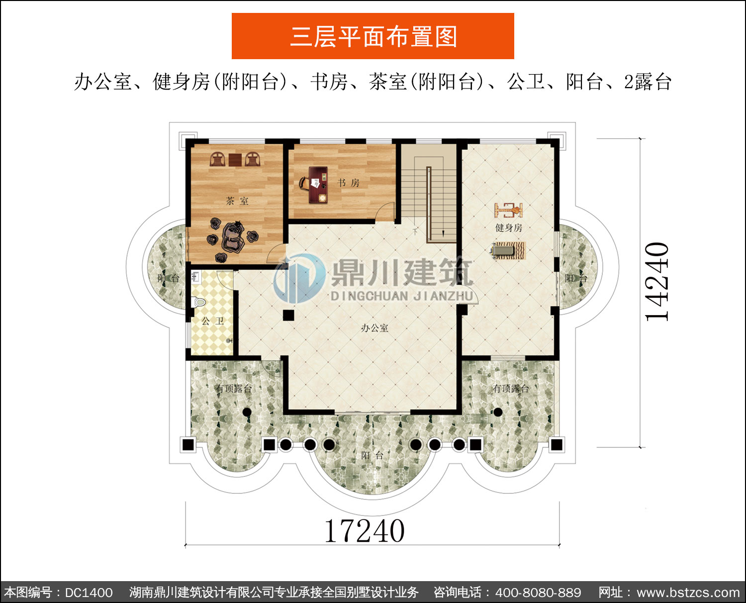 三 層: 辦公室、健身房(附陽臺(tái))、書房、茶室(附陽臺(tái))、公衛(wèi)、陽臺(tái)、2露臺(tái)