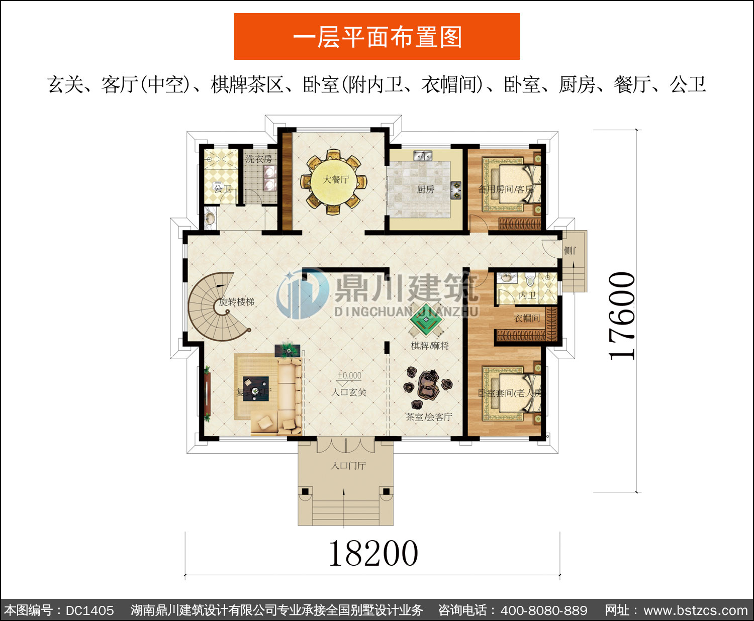 一 層: 玄關(guān)、客廳(中空)、棋牌茶區(qū)、臥室(附內(nèi)衛(wèi)、衣帽間)、臥室、廚房、餐廳、公衛(wèi)