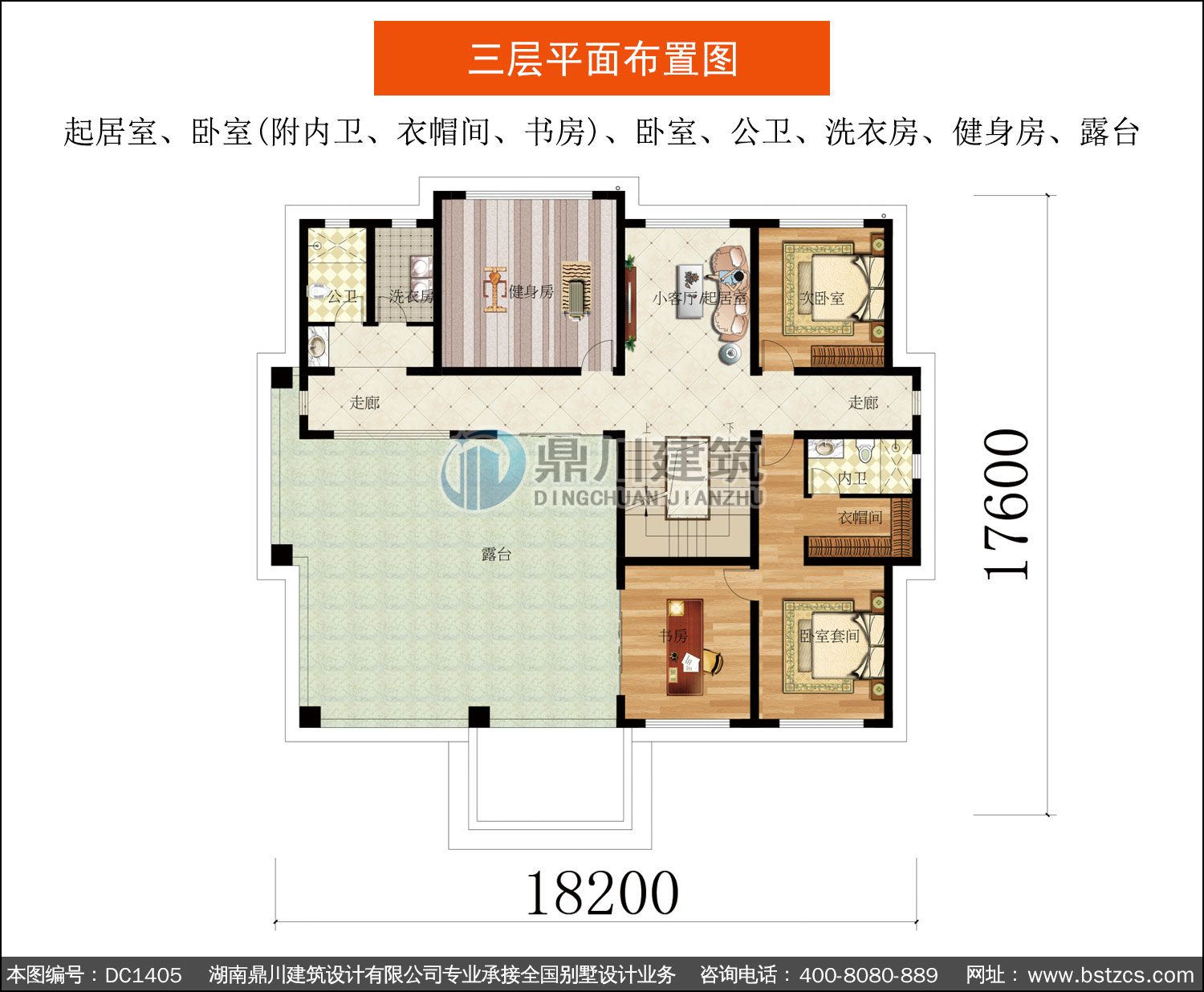三 層: 起居室、臥室(附內(nèi)衛(wèi)、衣帽間、書房)、臥室、公衛(wèi)、洗衣房、健身房、露臺