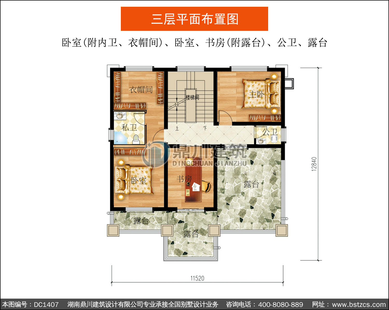 三 層: 臥室(附內(nèi)衛(wèi)、衣帽間)、臥室、書房(附露臺)、公衛(wèi)、露臺
