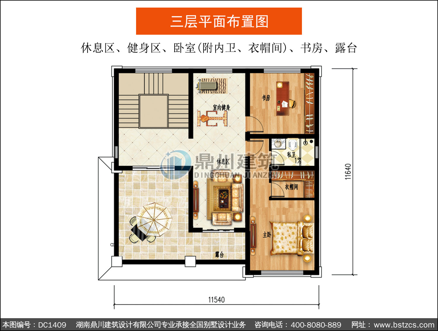 | 三 層: | 休息區(qū)、健身區(qū)、臥室(附內(nèi)衛(wèi)、衣帽間)、書房、露臺 | |||