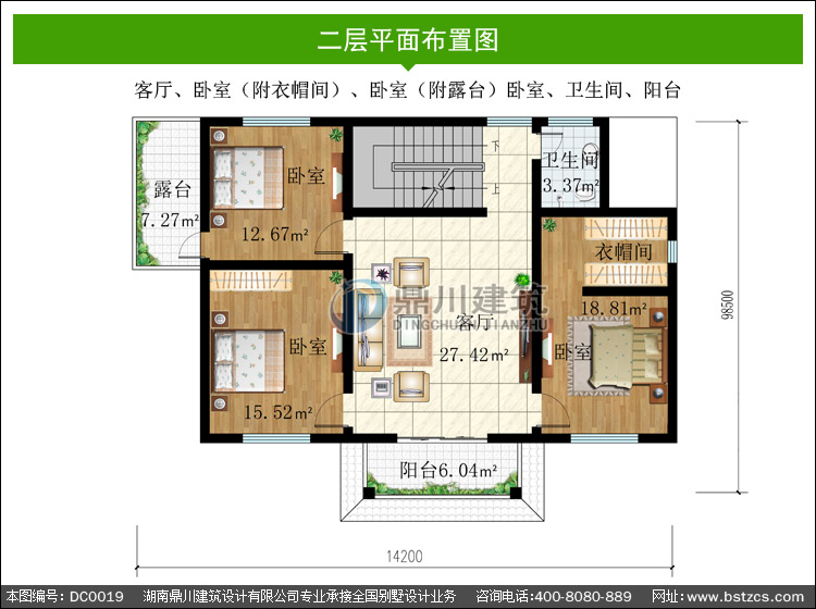 二 層: 客廳、臥室(附衣帽間)、臥室(附露臺)、臥室、衛(wèi)生間、陽臺