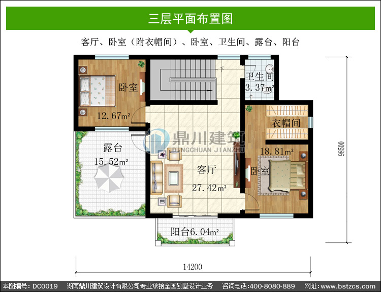 三 層: 客廳、臥室(附衣帽間)、臥室、衛(wèi)生間、露臺、陽臺