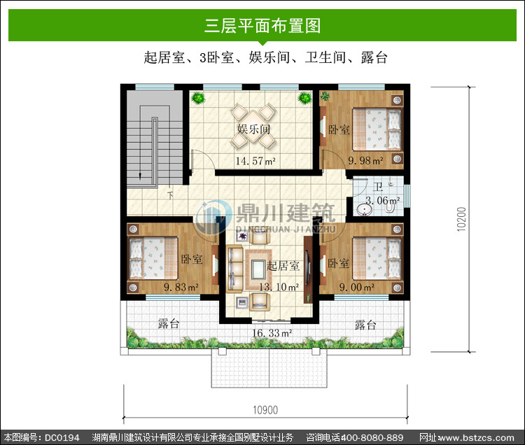 | 三 層: | 起居室、3臥室、娛樂間、衛(wèi)生間、露臺 | |||