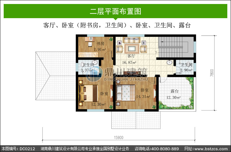 | 二 層: | 客廳、臥室(附書房,衛(wèi)生間)、臥室、衛(wèi)生間、露臺 | |||