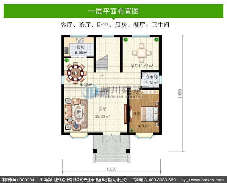 一 層: 客廳、茶廳、臥室、廚房、餐廳、衛(wèi)生間