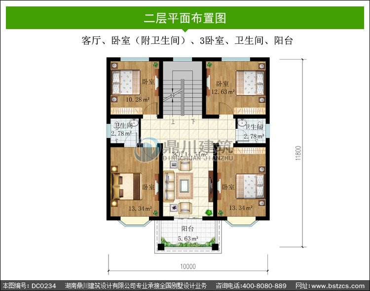 二 層: 客廳、臥室(附衛(wèi)生間)、3臥室、衛(wèi)生間、陽臺