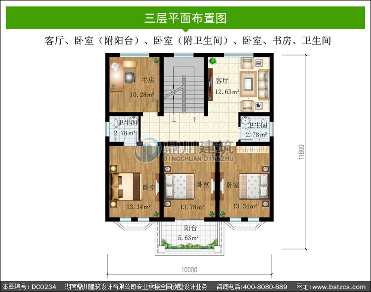 三 層: 客廳、臥室(附陽臺)、臥室(附衛(wèi)生間)、臥室、書房、衛(wèi)生間
