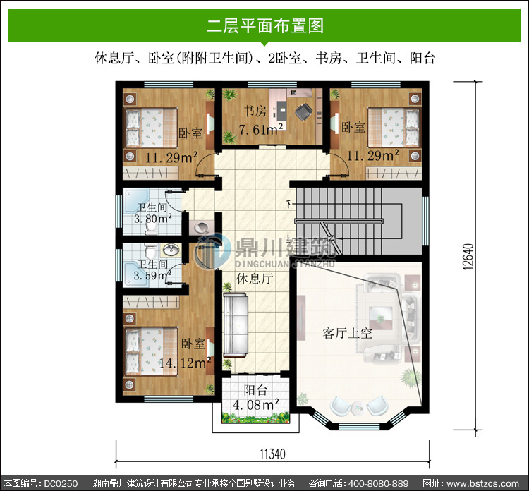 二 層: 休息廳、臥室(附附衛(wèi)生間)、2臥室、書房、衛(wèi)生間、陽臺