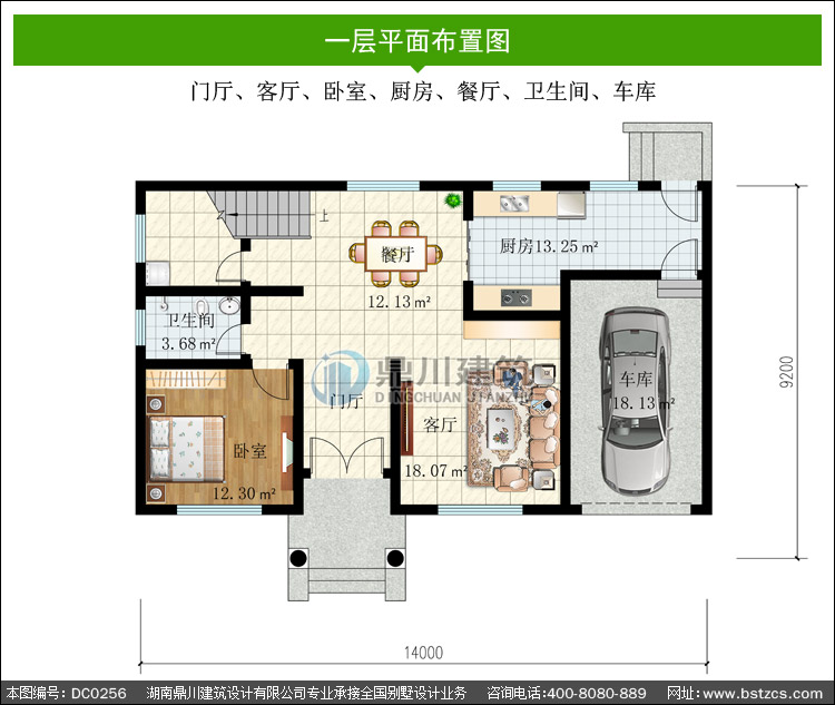 | 一 層: | 門廳、客廳、臥室、廚房、餐廳、衛(wèi)生間、車庫 | |||
