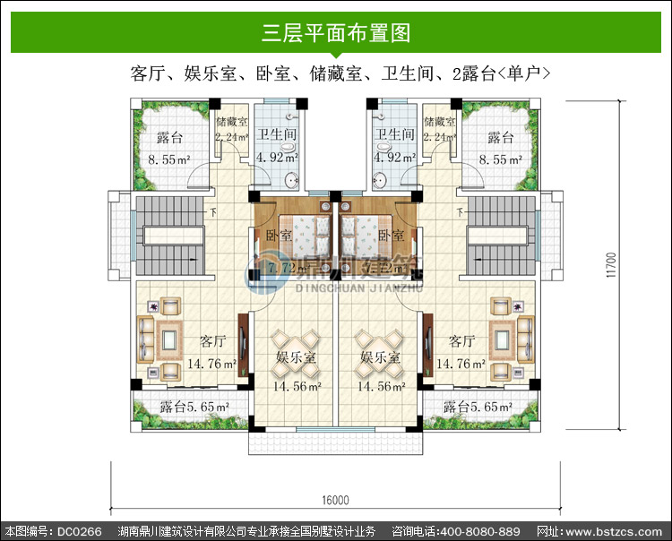 三 層: 客廳、娛樂室、臥室、儲(chǔ)藏室、衛(wèi)生間、2露臺(tái)
