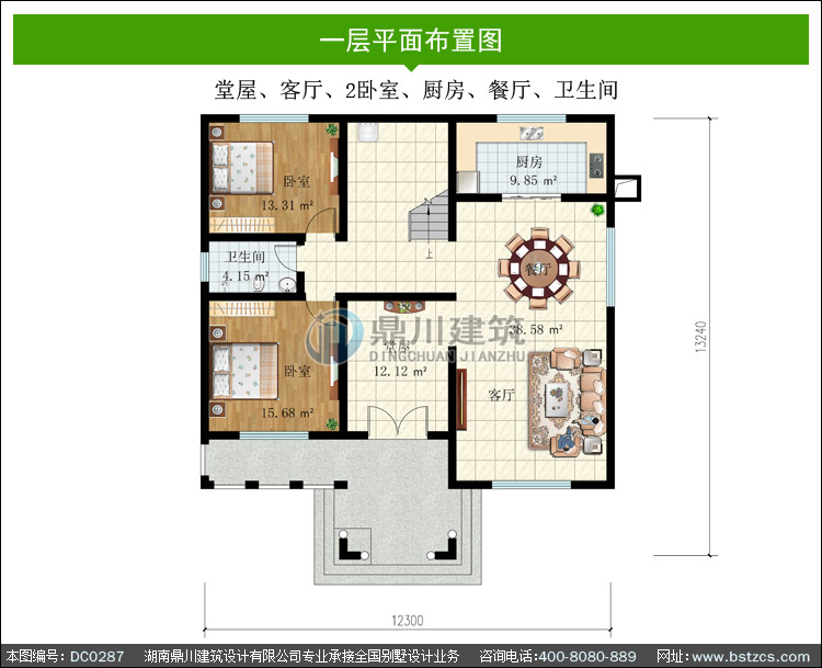 一 層: 堂屋、客廳、2臥室、廚房、餐廳、衛(wèi)生間