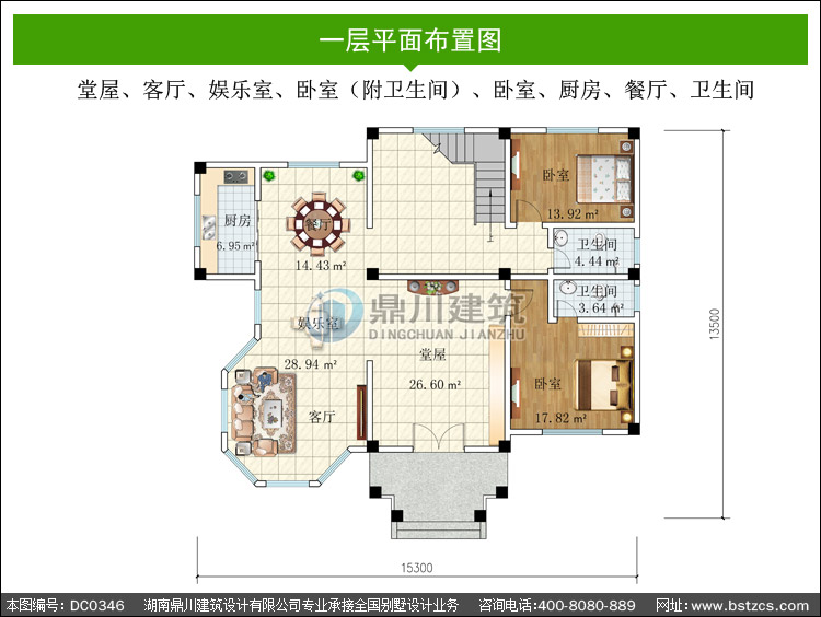 | 一 層: | 堂屋、客廳、娛樂(lè)室、臥室(附衛(wèi)生間)、臥室、廚房、餐廳、衛(wèi)生間 | |||