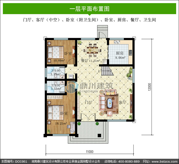 | 一 層: | 門廳、客廳(中空)、臥室(附衛(wèi)生間)、臥室、廚房、餐廳、衛(wèi)生間 | |||