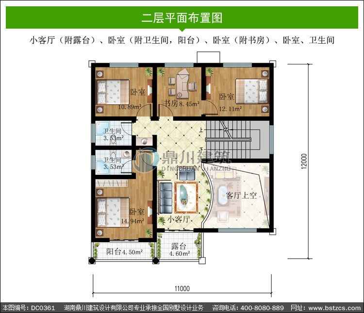 | 二 層: | 客廳(附露臺(tái))、臥室(附衛(wèi)生間,陽(yáng)臺(tái))、臥室(附書房)、臥室、衛(wèi)生間 | |||