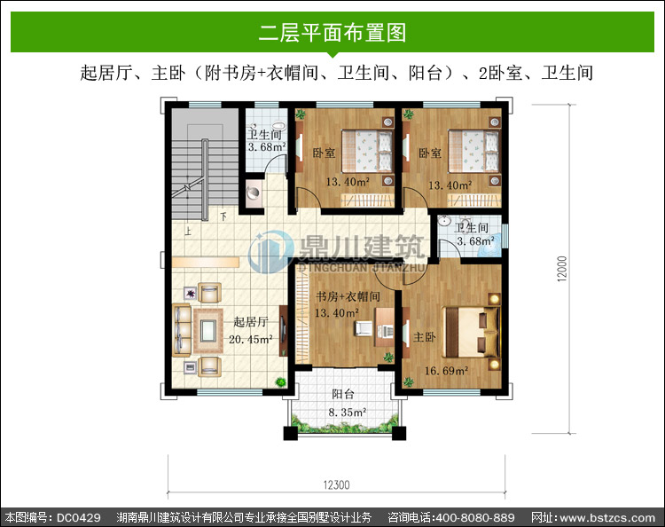 | 二 層: | 起居廳、主臥(附書房+衣帽間、衛(wèi)生間、陽(yáng)臺(tái))、2臥室、衛(wèi)生間 | |||