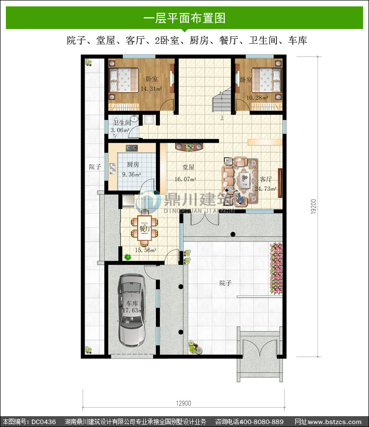 一 層: 院子、堂屋、客廳、2臥室、廚房、餐廳、衛(wèi)生間、車庫