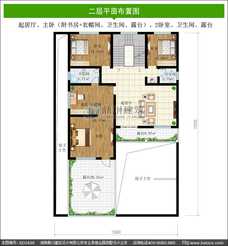 二 層: 起居廳、主臥(附書房+衣帽間、衛(wèi)生間、露臺(tái))、2臥室、衛(wèi)生間、露臺(tái)