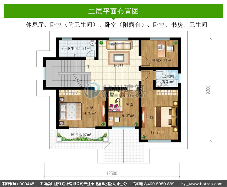 二 層: 休息廳、臥室(附衛(wèi)生間)、臥室(附露臺(tái))、臥室、書(shū)房 、衛(wèi)生間