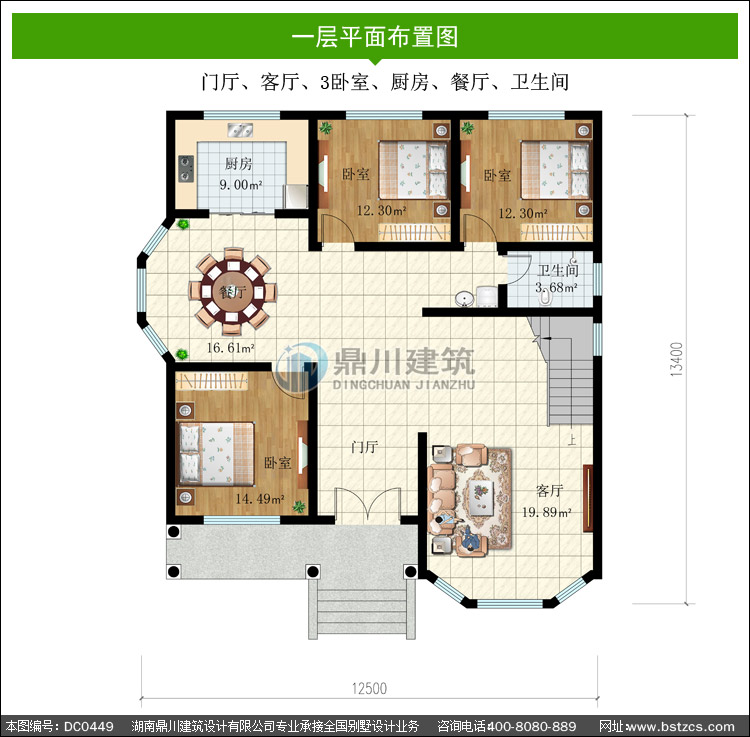 | 一 層: | 門廳、客廳、3臥室、廚房、餐廳、衛(wèi)生間 | |||