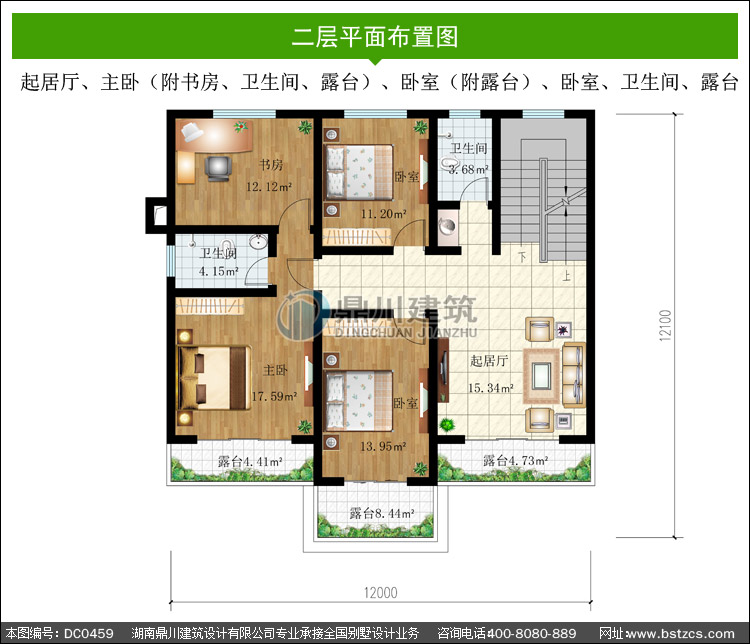 二 層: 起居廳、主臥(附書房、衛(wèi)生間、露臺)、臥室(附露臺)、臥室、衛(wèi)生間、露臺