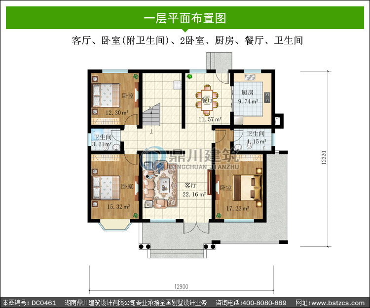 | 一 層: | 客廳、臥室(附衛(wèi)生間)、2臥室、廚房、餐廳、衛(wèi)生間 | |||