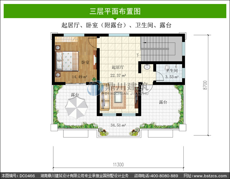 三 層: 起居廳、臥室(附露臺(tái))、衛(wèi)生間、露臺(tái)