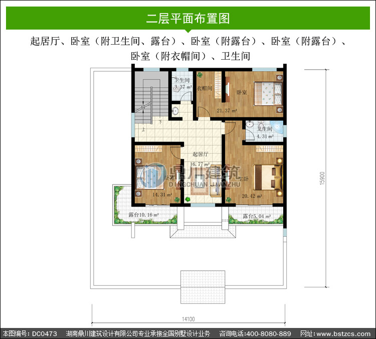 | 二 層: | 起居廳、臥室(附衛(wèi)生間、露臺)、臥室(附露臺)、臥室 (附露臺)、臥室(附衣帽間)、衛(wèi)生間 | |||