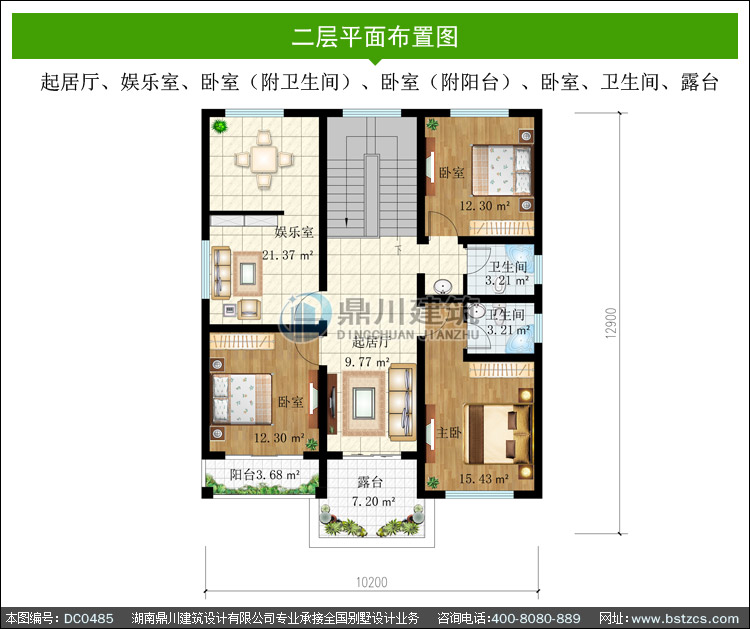 | 二 層: | 起居廳、娛樂室、臥室(附衛(wèi)生間)、臥室(附陽臺(tái))、臥室、衛(wèi)生間、露臺(tái) | |||