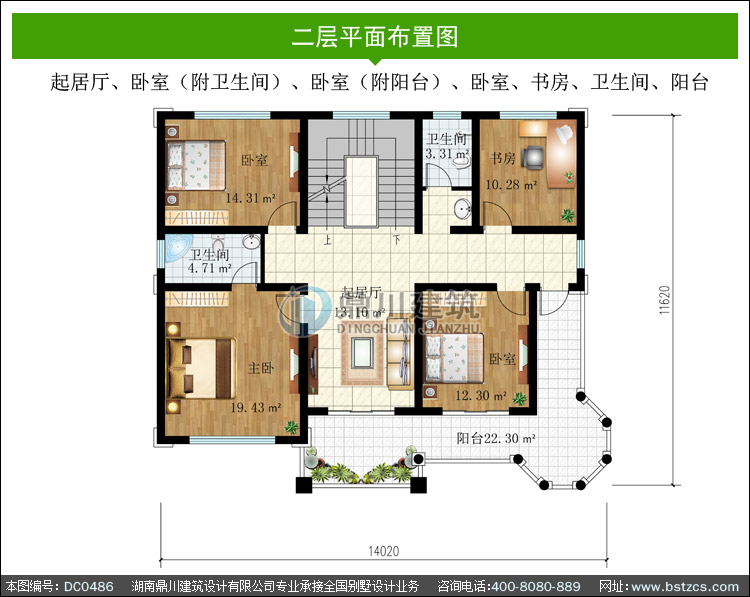 | 二 層: | 起居廳、臥室(附衛(wèi)生間)、臥室(附陽臺)、臥室、書房、衛(wèi)生間、陽臺 | |||