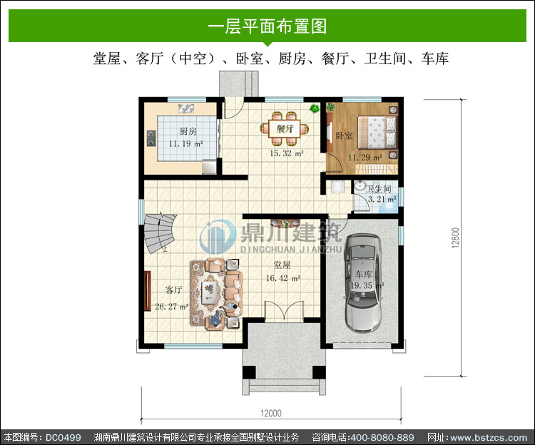 | 一 層: | 堂屋、客廳(中空)、臥室、廚房、餐廳、衛(wèi)生間、車庫 | |||