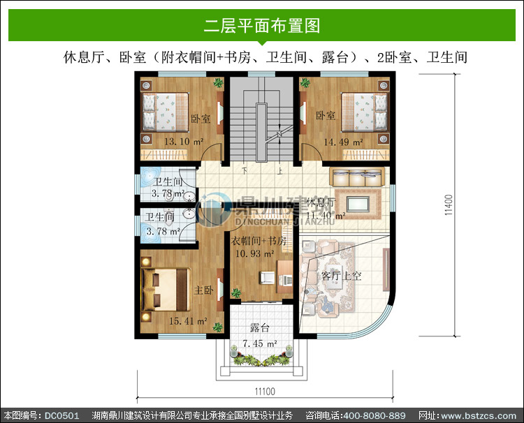 | 二 層: | 休息廳、臥室(附衣帽間+書房、衛(wèi)生間、露臺(tái))、2臥室、衛(wèi)生間 | |||
