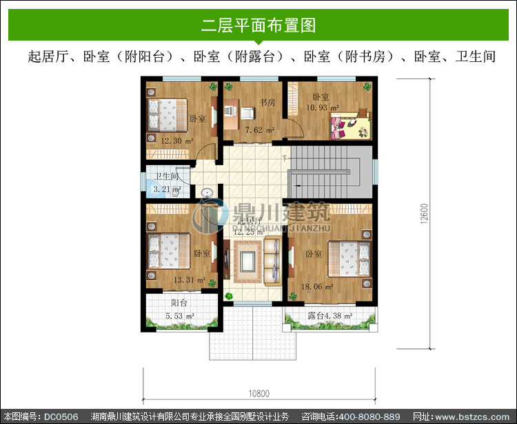 二 層: 起居廳、臥室(附陽(yáng)臺(tái))、臥室(附露臺(tái))、臥室(附書房)、臥室、衛(wèi)生 間