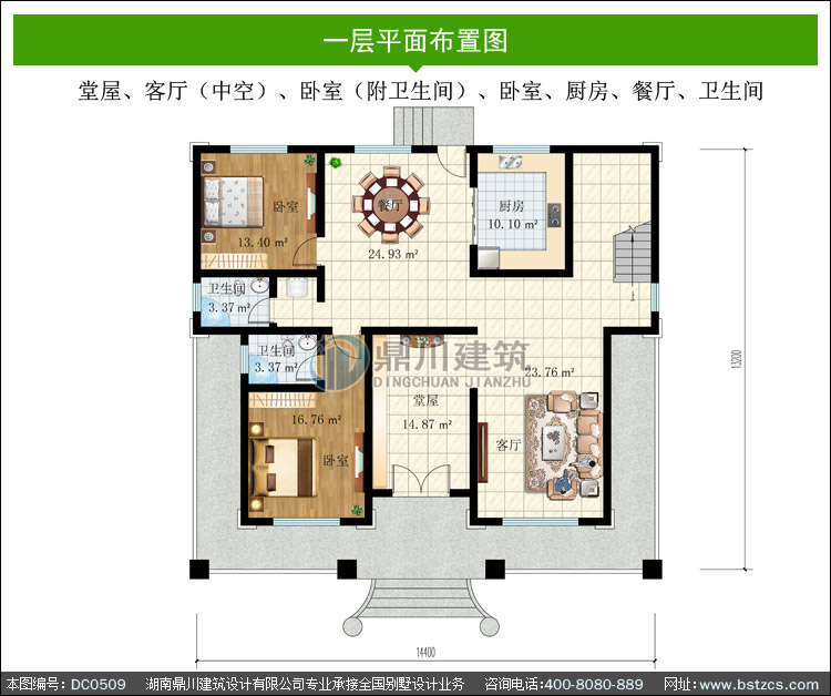 一 層: 堂屋、客廳(中空)、臥室(附衛(wèi)生間)、臥室、廚房、餐廳、衛(wèi)生間