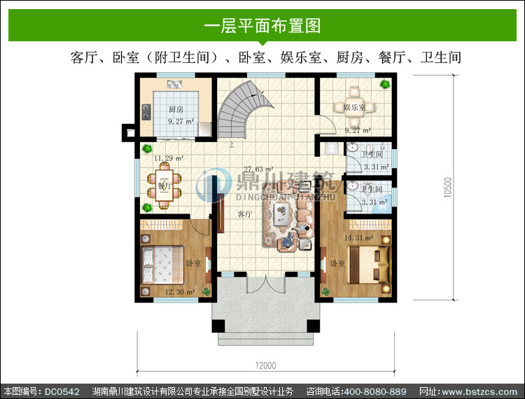 | 一 層: | 客廳、臥室(附衛(wèi)生間)、臥室、娛樂室、廚房、餐廳、衛(wèi)生間 | |||