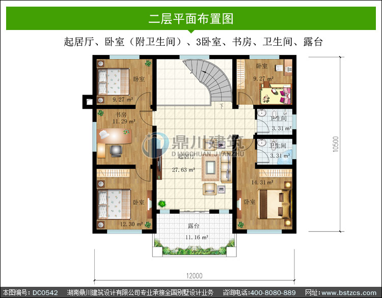 | 二 層: | 起居廳、臥室(附衛(wèi)生間)、3臥室、書房、衛(wèi)生間、露臺 | |||